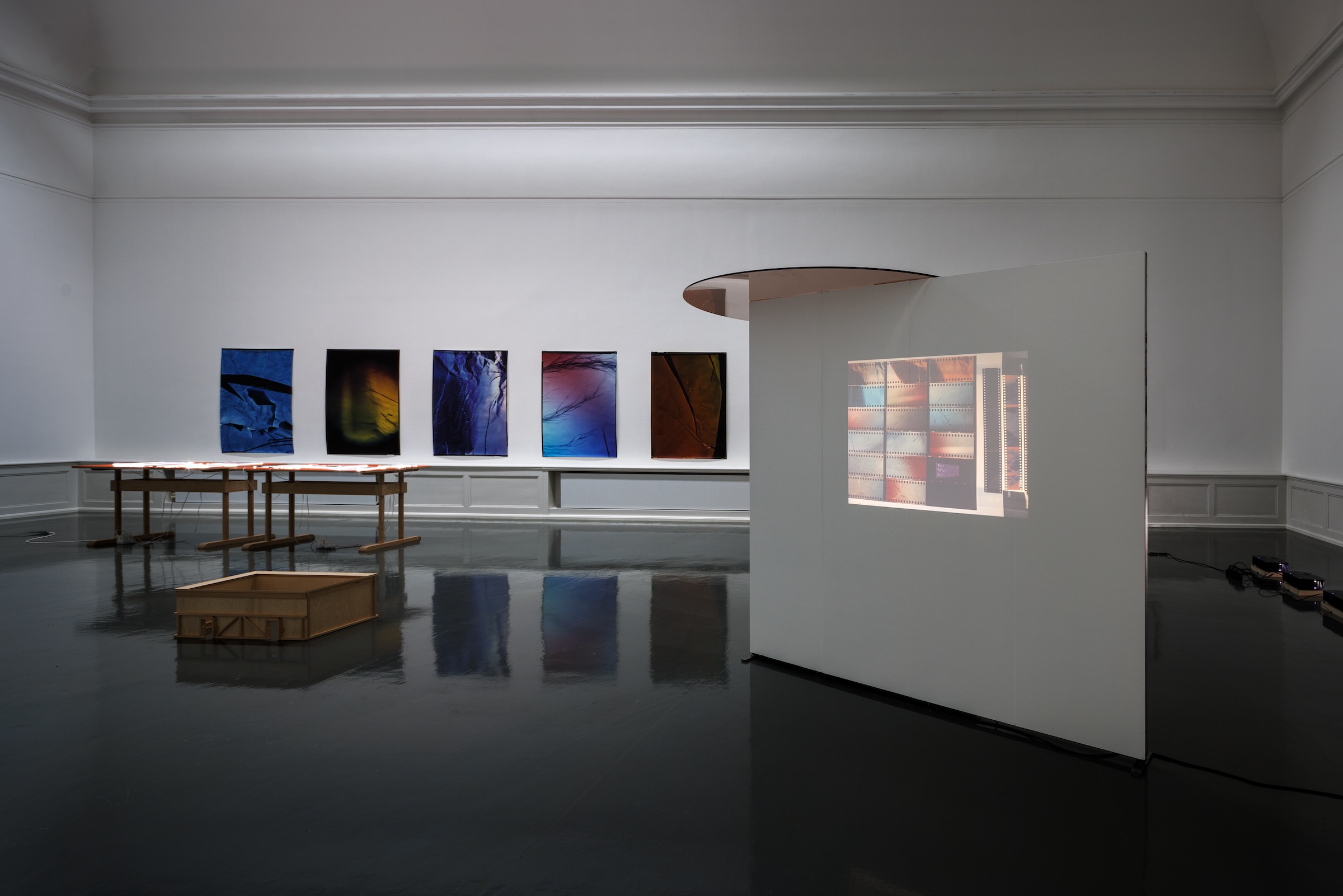 Im ersten Raum der Ausstellung ist die Filminstallation Prelude: Photography is my Punishment (2024) zu sehen, die wie eine interpretative Einführung fungiert, indem sie mit einem vom Künstler angefertigten Modell des zentralen großen Saals des Kunstvereins bereits auf den nächsten angrenzenden Raum anspielt. Hier entfaltet sich ein ambitioniertes, vielschichtiges Environment, das als Vonna-Michell room verschiedene Arbeiten beinhaltet, wie Nudging & Spooling (2023–2024), eine Mittelformat-Diaprojektion, Soundarbeit und digitale Videoprojektion; die Installation Collections & Collaborations (study I) (2023) in Form eines Leuchtkastens sowie Slits (2024), eine Serie mit Fotoabzügen, die um eine zentrale Vorrichtung positioniert sind und in einer kaleidoskopartigen Montage eine Vielzahl von archivarischen Blickwinkeln auf Themen wie persönliche Identität und Geschichte einnehmen. In den folgenden Kabinetten entfaltet sich eine eher formale, historische und chronologische Erzählung, die eine gewisse, wie Tris Vonna-Michell es formuliert, „technologische Alchemie“ aufzeigt, die sich in den Übergängen oder Zwischenräumen von einzelnen künstlerischen Praktiken entfaltet. Im ersten Kabinett werden Gemeinschaftsarbeiten von Henri Chopin und Ed Vonna-Michell gezeigt, darunter To Ray the Rays (1985), sowie Drucke der beiden Künstler. Darauf folgt im 2. Kabinett eine Neuauflage von Tris Vonna-Michells Filminstallation Finding Chopin (2005–2024), eine Tischinstallation mit Fotografien, Fundstücken, Reisezubehör und Projektionen. Ihren Ursprung hat die Arbeit in Vonna-Michells Versuch, Chopin Mitte der 2000er Jahre in Paris aufzuspüren. Der diesem Werk innewohnende psychogeografische Charakter ist in vielen anderen Arbeiten von Tris Vonna-Michell präsent, wie beispielsweise in hahn-huhn (2003–2016), Wasteful Illuminations (2008–2018) und Capitol Complex (2012–2015).